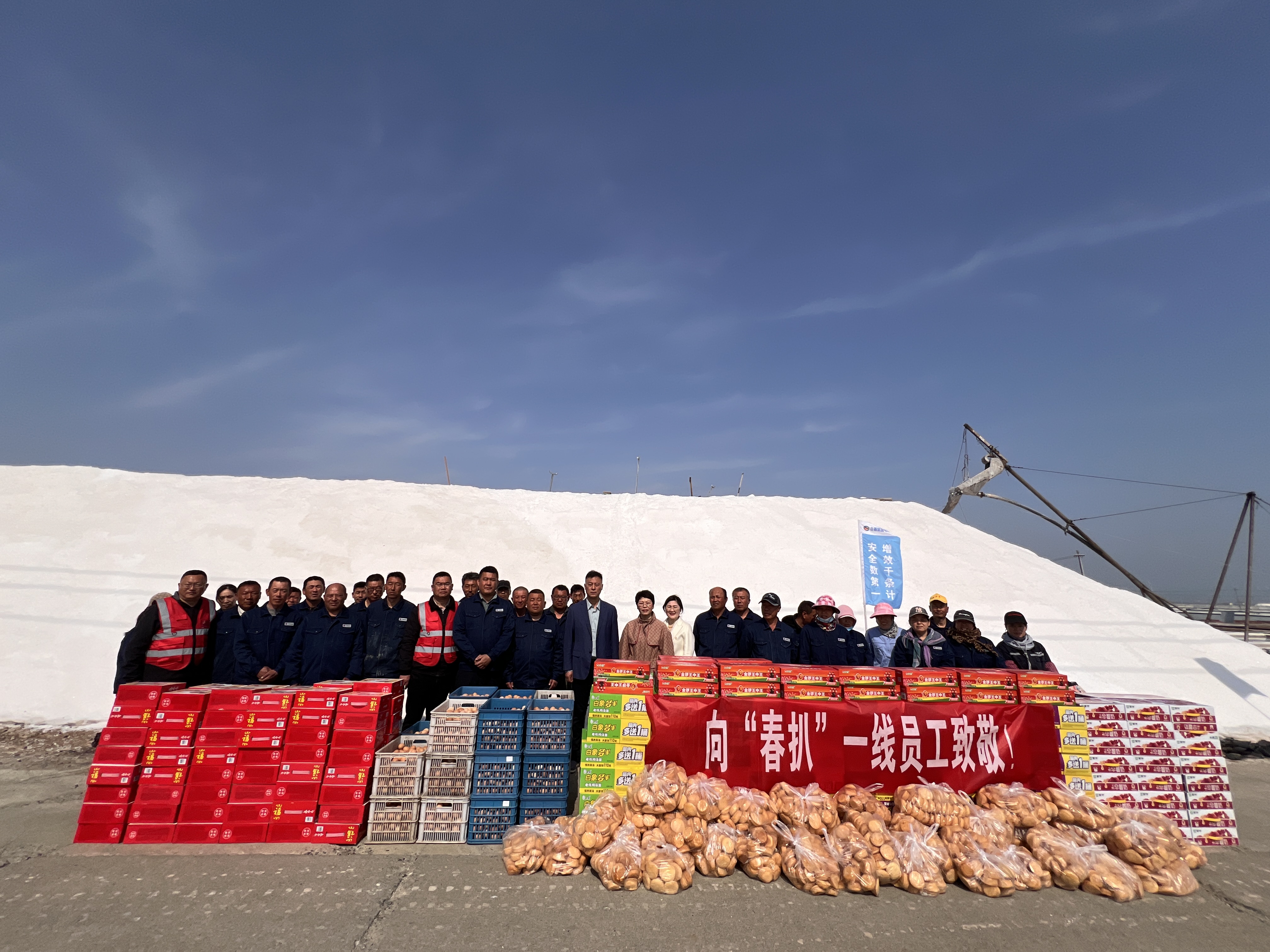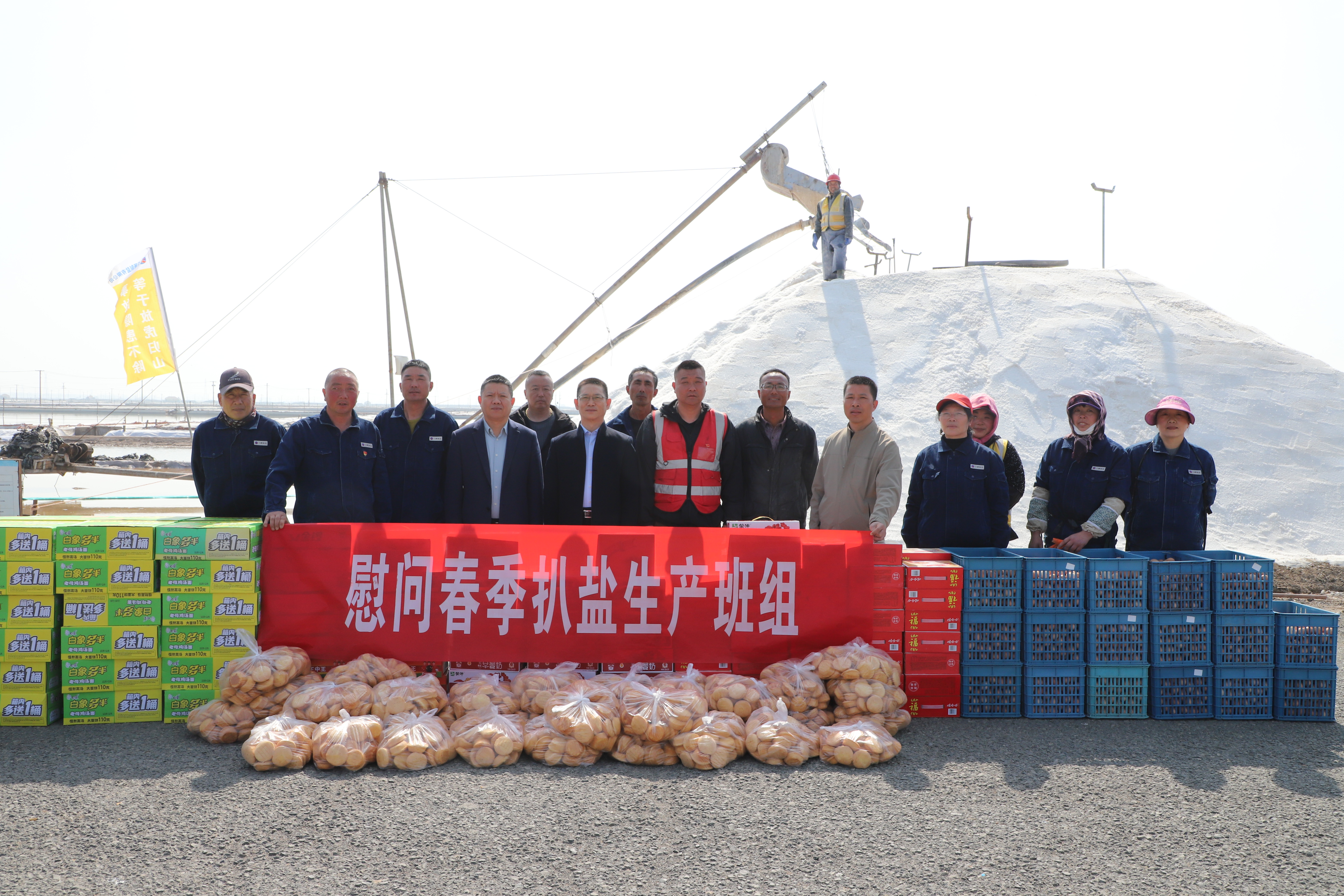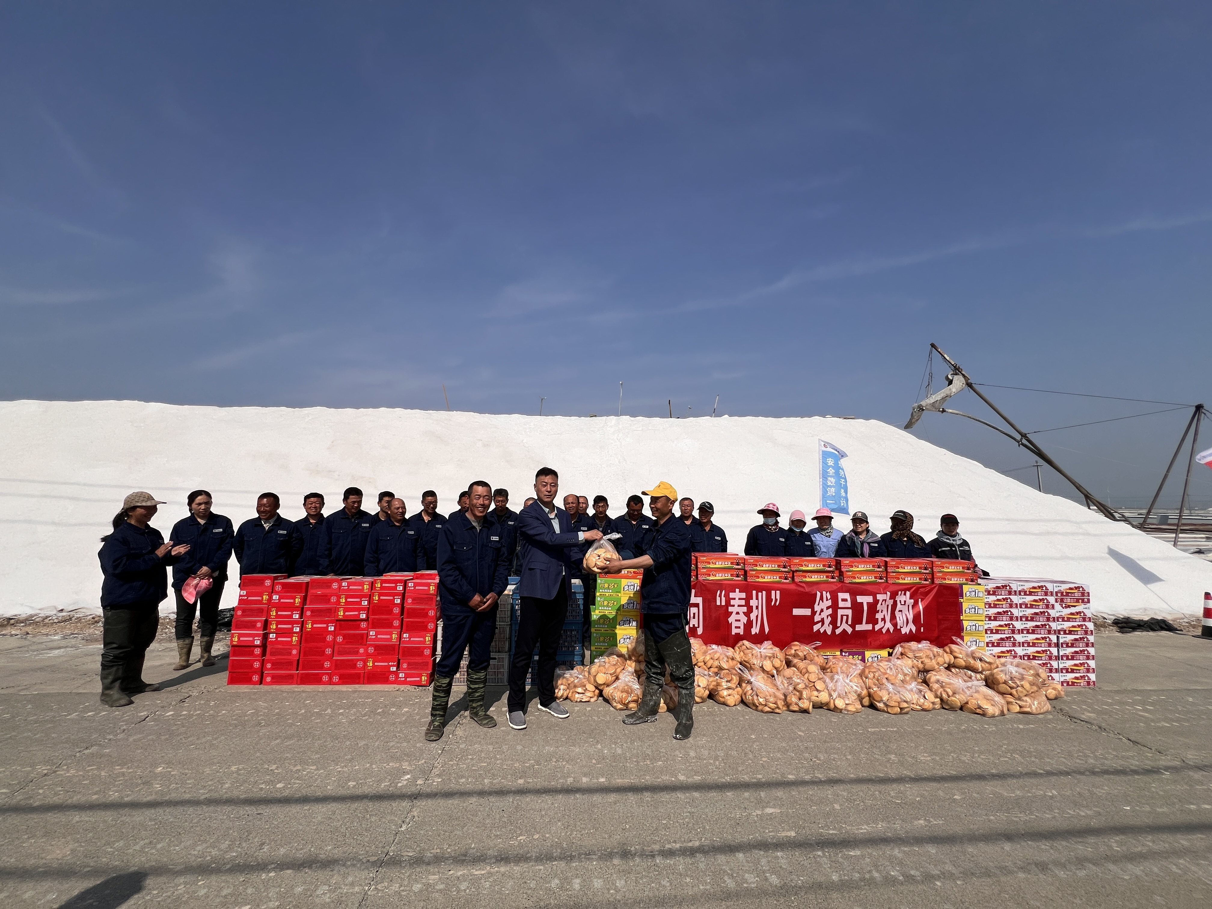 “你們辛苦了,我代表公司來看望大家?!痹谛潞邮嗯c埒南十一班,吳衛(wèi)平與扒鹽現(xiàn)場職工握手問好,感謝他們?cè)谶^去的一年為日曬制鹽公司的原鹽生產(chǎn)所付出的辛勤努力,叮囑他們一定要落實(shí)落細(xì)扒鹽生產(chǎn)措施,增強(qiáng)責(zé)任感和警覺性,嚴(yán)格執(zhí)行各項(xiàng)規(guī)章制度,切實(shí)保障扒鹽期間的安全生產(chǎn),并送上雞蛋、八寶粥、方便面、牛奶等物品。