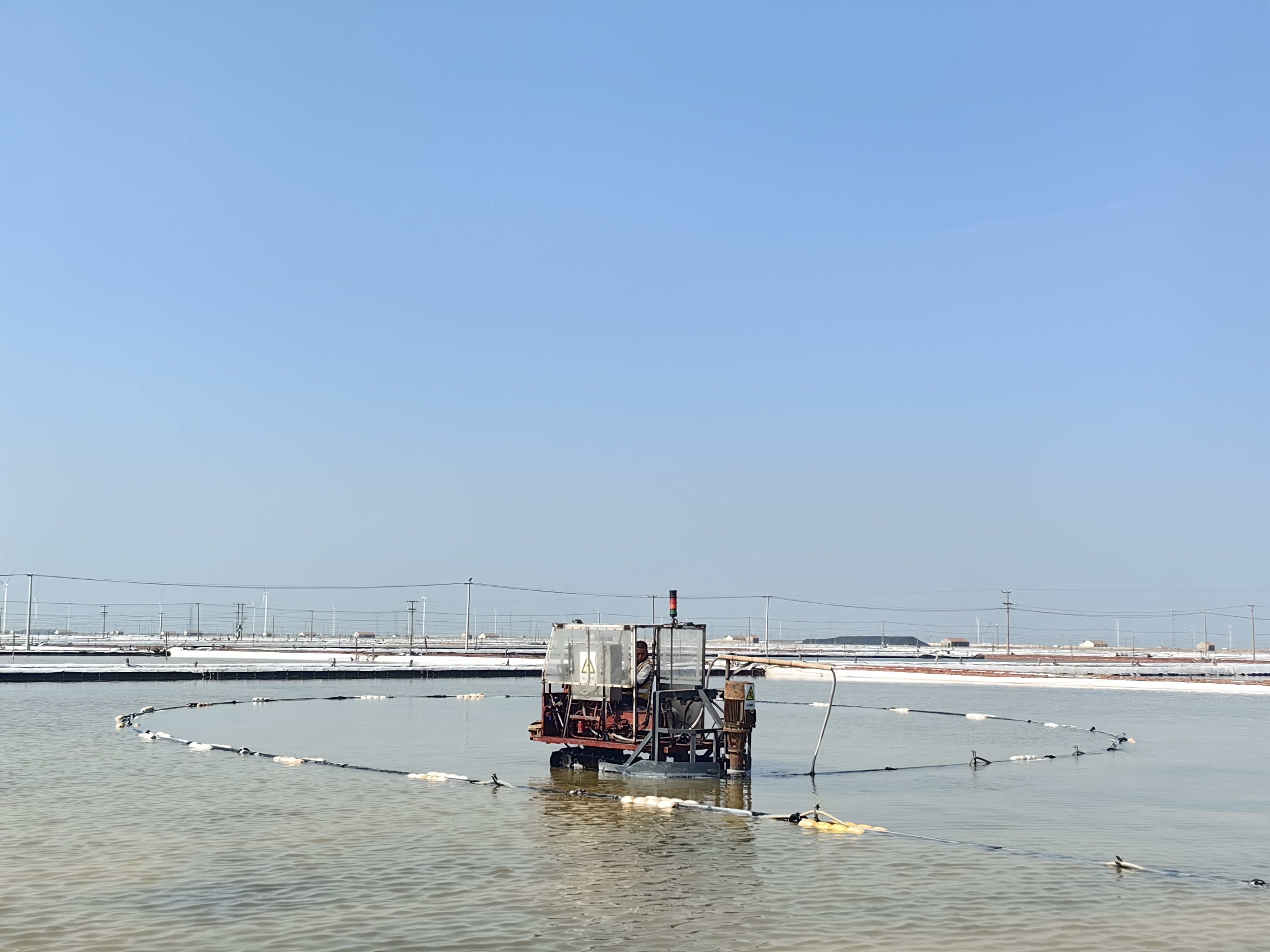 在八班扒鹽現(xiàn)場,一臺唐三零扒鹽機(jī)正在鹽池里進(jìn)行扒鹽作業(yè),唐三零操作手駕駛著機(jī)械,在鹽田中央緩緩行進(jìn)著,不時的回頭觀察鹽泵吸鹽情況,確保扒鹽管道順暢。遠(yuǎn)處的廩基內(nèi),大廩工正在熟練地利用分流板對鹽篩中傾瀉下的原鹽進(jìn)行引導(dǎo)分流,熟練地打好廩墻。