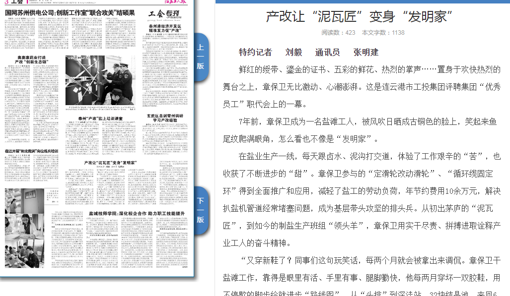 12月9日,《江蘇工人報(bào)》第三版刊登灌西公司產(chǎn)改故事:產(chǎn)改讓“泥瓦匠”變身“發(fā)明家”