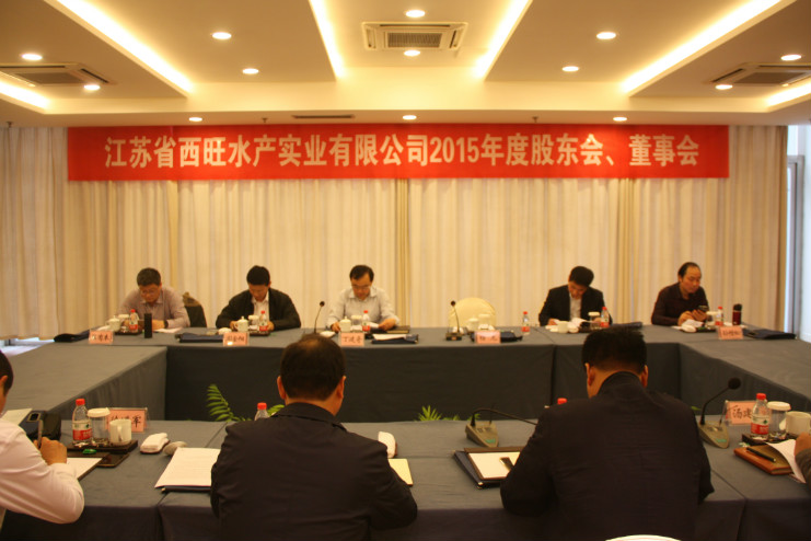 4月22日下午,江蘇省西旺水產(chǎn)實業(yè)公司2015年度股東會、董事會在墟溝召開,省沿海開發(fā)集團(tuán)總經(jīng)理丁建奇、副總經(jīng)理周金陽等股東代表、董事代表出席了會議。會議由連云港市工業(yè)投資集團(tuán)副總經(jīng)理楊國新主持。