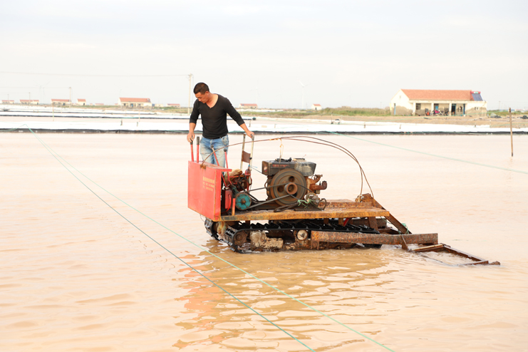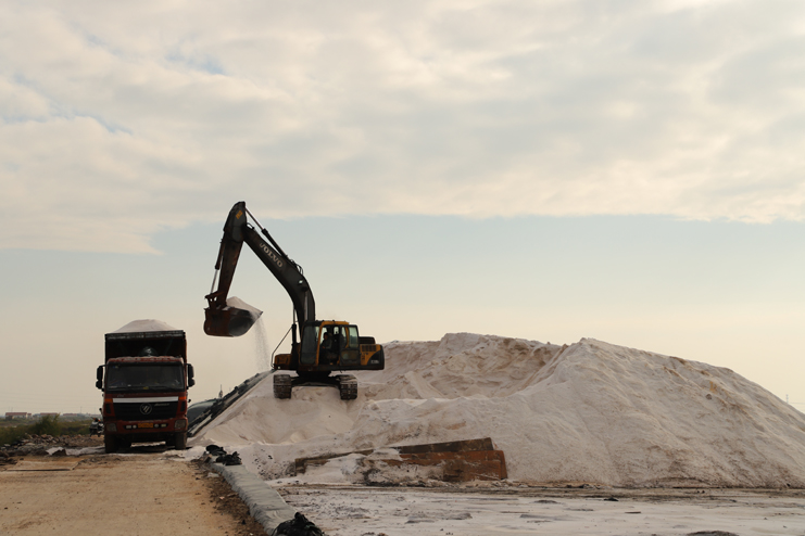 6日下午,在新河制鹽分公司的十二班,扒鹽機(jī)組正在扒鹽,在不遠(yuǎn)處鹽池內(nèi),集鹽機(jī)械正在鹽池內(nèi)緩緩移動(dòng)集鹽,鹽泵運(yùn)轉(zhuǎn)不停,輸鹽上廩,鹽廩上兩名大廩工正在不停筑廩。鹽池內(nèi),有的員工對(duì)破碴作業(yè)機(jī)械進(jìn)行修理,有的員工在整平扒過鹽的格塊,有的員工在活碴。筆者從該班班長(zhǎng)徐正好處了解到,該公司5號(hào)就開機(jī)扒鹽了,下半年以來,十二班已經(jīng)扒鹽7000余噸。在新河制鹽分公司的十一班,班長(zhǎng)葛高劍正帶領(lǐng)員工裝運(yùn)大廩布,做好扒鹽的準(zhǔn)備工作;在埒南制鹽分公司的九班,機(jī)聲隆隆,一名員正開著活碴機(jī)械在鹽池內(nèi)作業(yè),不遠(yuǎn)處有幾名員工正用土工布叉格埝,對(duì)灘場(chǎng)進(jìn)行維修亮化;八班有一臺(tái)挖掘機(jī)正在鹽廩旁給裝鹽車輛上鹽……,日曬制鹽公司鹽灘上到處都活躍著職工們忙碌的身影。