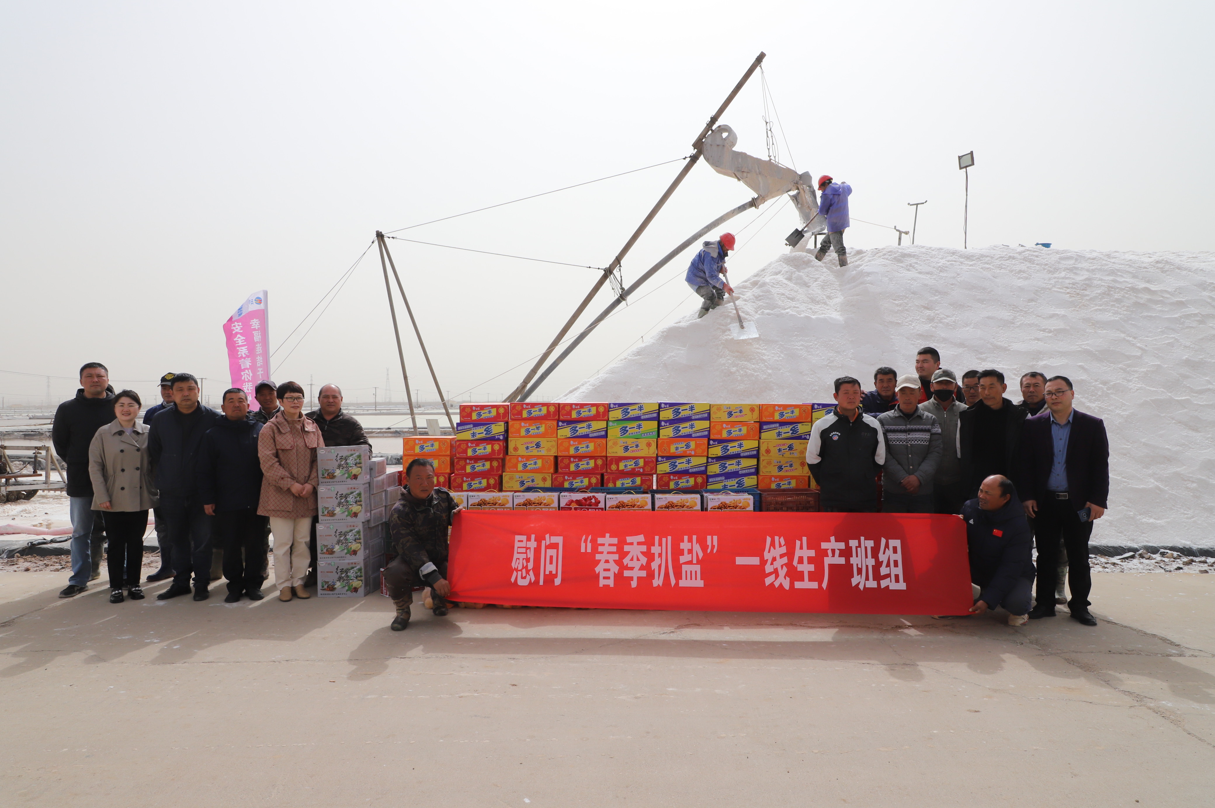 “你們辛苦了,我代表公司來看望大家?!痹谛潞泳虐嗯c埒南九班,王宏與扒鹽現(xiàn)場職工握手問好,感謝他們在過去的一年為日曬制鹽公司的原鹽生產(chǎn)所付出的辛勤努力,叮囑他們一定要落實落細(xì)扒鹽生產(chǎn)措施,增強責(zé)任感和警覺性,嚴(yán)格執(zhí)行各項規(guī)章制度,切實保障扒鹽期間的安全生產(chǎn),并送上雞蛋、八寶粥、方便面、牛奶等物品。