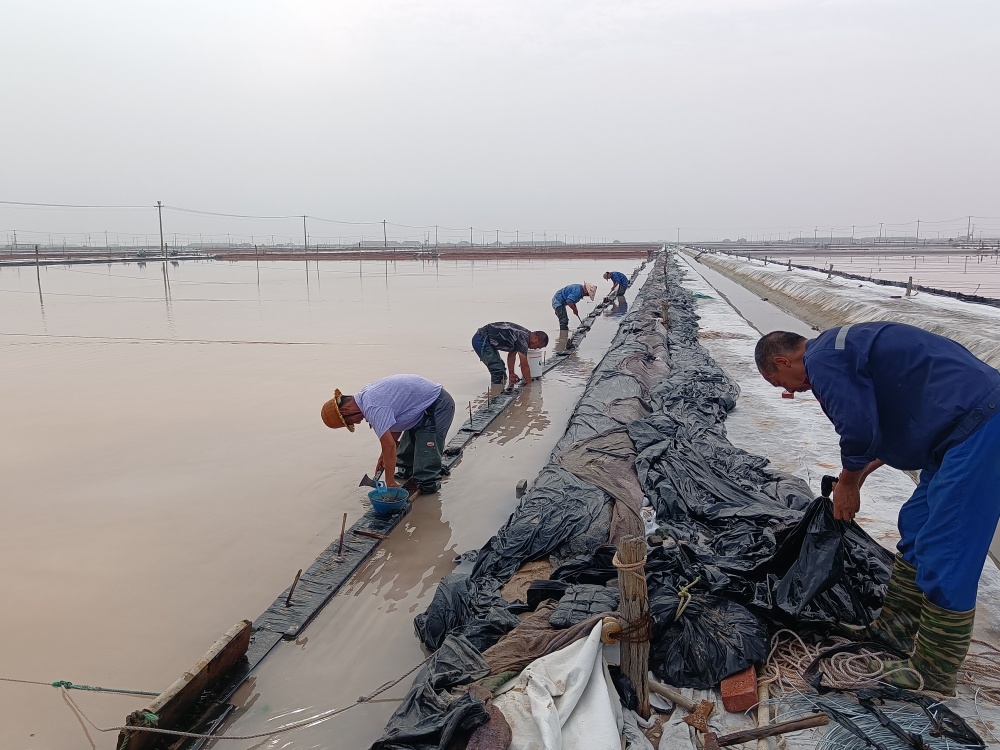隨著主汛期到來,由于各班組部分塑布已達使用年限,老化嚴重,且容易造成鹵水跑漏現(xiàn)象發(fā)生,為了減少鹵水損耗,7月10日,新河制鹽分公司黨支部組織黨員突擊隊到班組對到期塑布進行更換。
