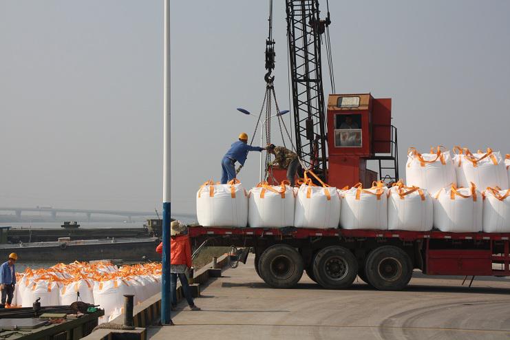 4月30日上午9時許,隨著一聲汽車長笛,一輛載有近40噸化工物資的卡車徐徐??吭谙笪锪鞴疚骞嗪哟a頭邊,緊接著碼頭鐵臂起舞,機械操作工嫻熟地操縱著塔吊機械,準(zhǔn)確地將一包包噸貸物資裝卸在碼頭邊的貨船中。。。。。。自此,一輛輛滿載40余噸貨物的卡車源源不斷向碼頭駛來。