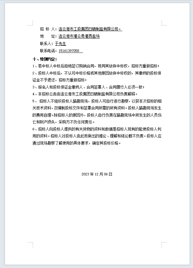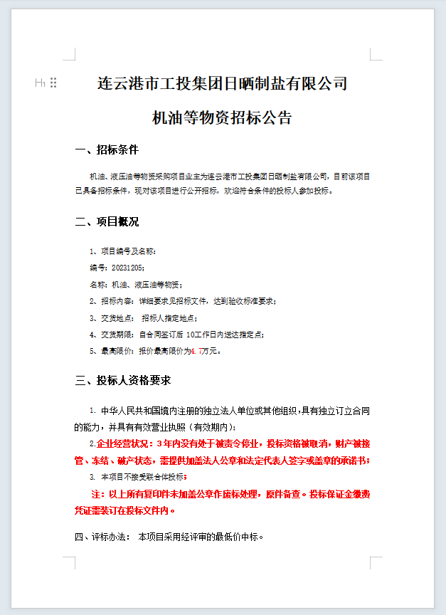 連云港市工投集團日曬制鹽有限公司機油等物資招標(biāo)公告