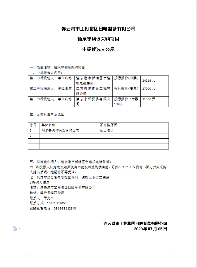 連云港市工投集團日曬制鹽有限公司軸承等物資采購項目中標候選人公示
