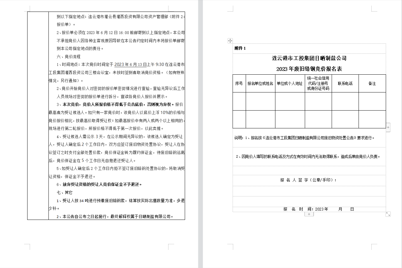 連云港市工投集團日曬制鹽有限公司廢舊鉻鋼處置公告