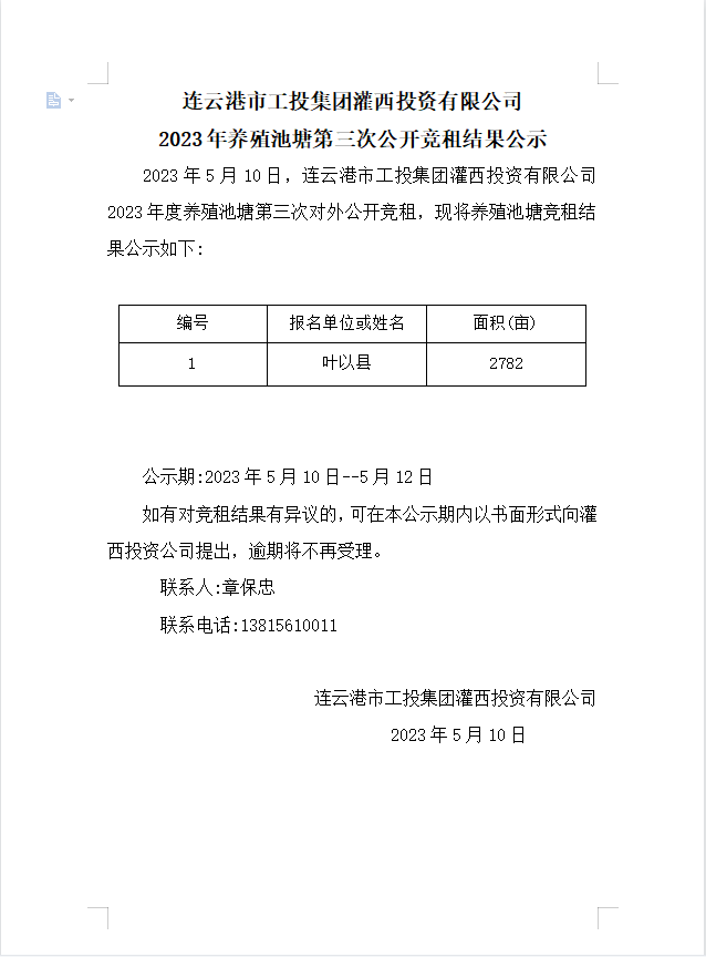 連云港市工投集團灌西投資有限公司2023年養(yǎng)殖池塘第三次公開競租結(jié)果公示