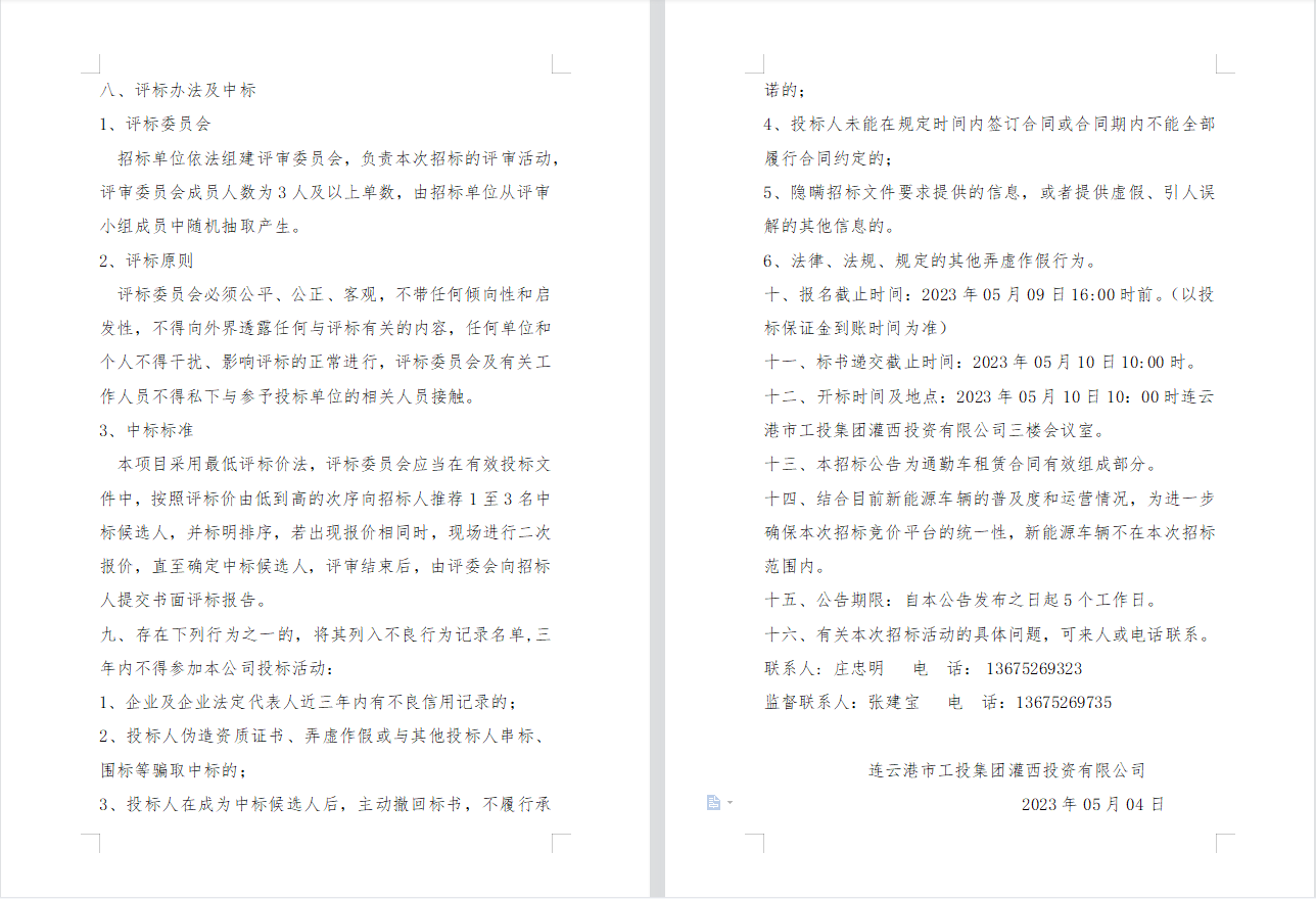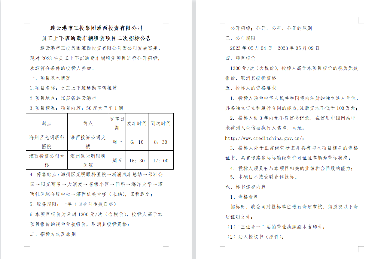 連云港市工投集團灌西投資有限公司 員工上下班通勤車輛租賃項目二次招標(biāo)公告