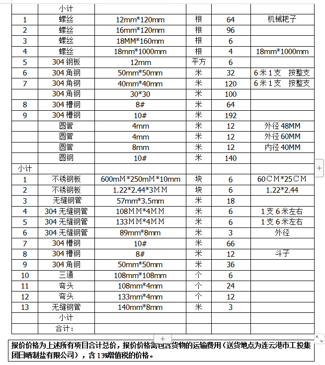 單價(jià)(含13%稅、運(yùn)輸費(fèi)用)。合同期間304不銹鋼單價(jià)不以304不銹鋼市場(chǎng)單價(jià)的變動(dòng)而作任何調(diào)整。