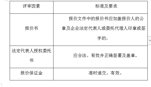 2、評(píng)審委員會(huì)將根據(jù)以下標(biāo)準(zhǔn)對(duì)各報(bào)價(jià)人進(jìn)行初步評(píng)審,有一項(xiàng)不符合要求的,作否決報(bào)價(jià)處理,不進(jìn)入詳細(xì)評(píng)審。