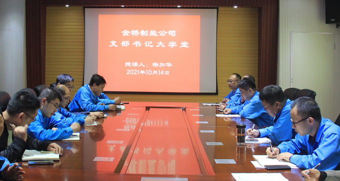 10月14日下午,我公司黨委在四樓黨建活動室組織開展“支部書記大學(xué)堂”活動。雪花鹽車間黨支部副書記楊加華以“學(xué)黨史守初心 充分發(fā)揮戰(zhàn)斗堡壘作用”為主題,結(jié)合車間工作實際,為各支部黨員干群上了一堂生動的黨課。通過此次活動的開展,引導(dǎo)廣大黨員干群學(xué)習(xí)百年黨史,牢記初心使命,進一步堅定信心,鼓足干勁,齊心協(xié)力推動全年目標順利實現(xiàn)。(金宣)
