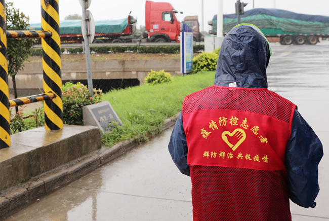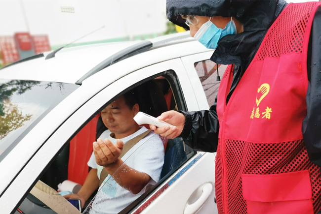 “您好,請(qǐng)出示一下行程碼,做下登記?!眻?jiān)守在崗位,逆風(fēng)迎雨,對(duì)車輛進(jìn)行逐一登記和體溫檢查,絲毫沒有受天氣的影響。
