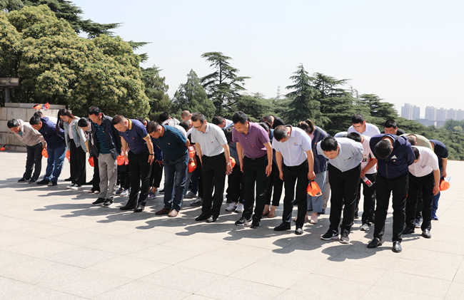 在烈士紀(jì)念塔前,公司黨委副書(shū)記梁永帶領(lǐng)全體黨員向淮海戰(zhàn)役烈士敬獻(xiàn)花籃,并三鞠躬。