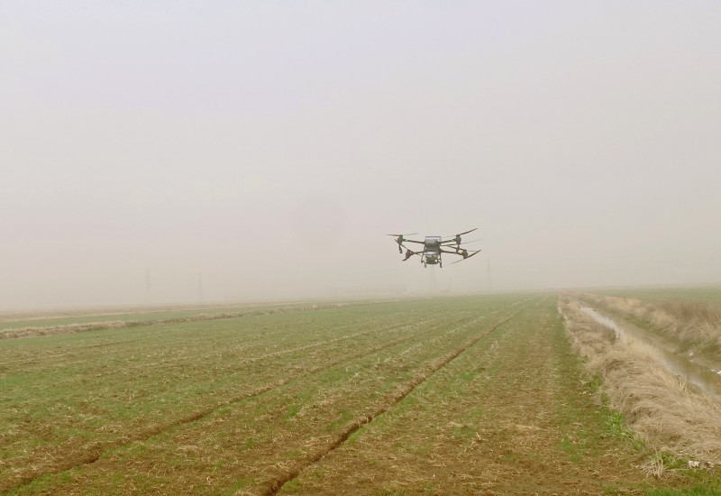 3月23日,大新農(nóng)場(chǎng)正在使用植保機(jī)開(kāi)展小麥?zhǔn)┓首鳂I(yè)。