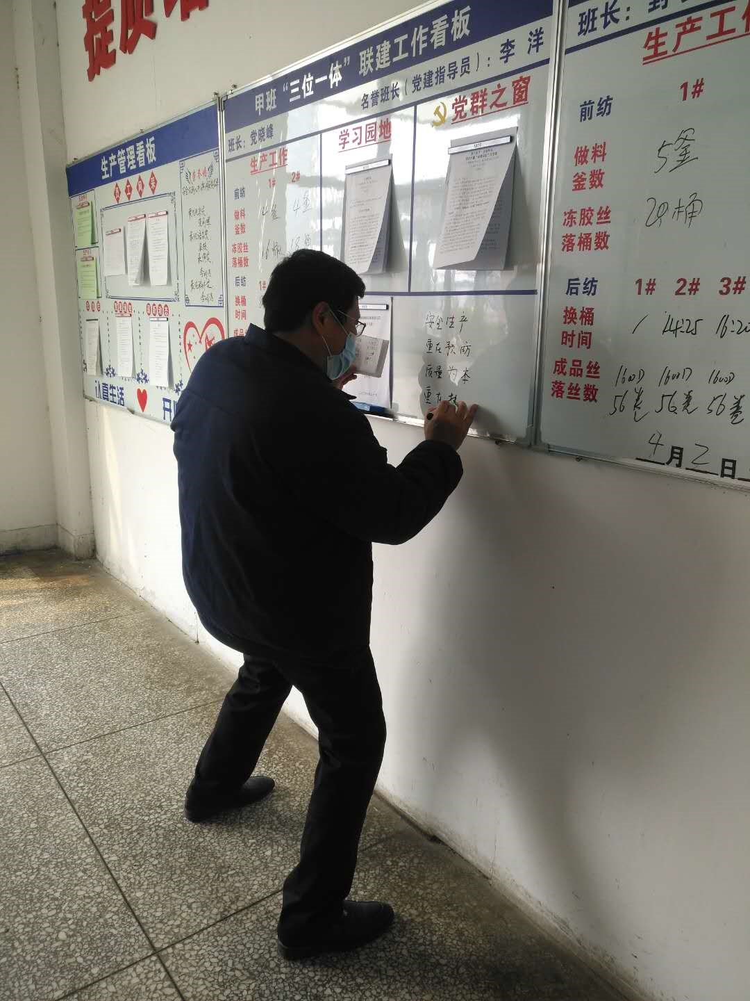 圖為生產(chǎn)設(shè)備部副部長王勇為甲班書寫班組口號(hào)。
