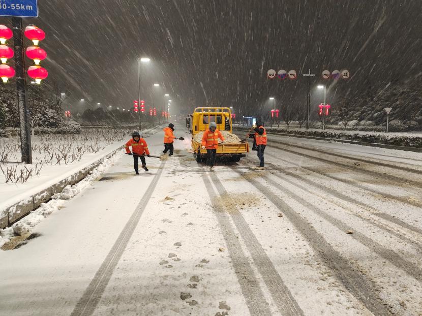 深夜時分,該公司負責人趙陽、副經(jīng)理孫振剛等領導班子成員及管理人員,帶領徐育華、王永等數(shù)名工人,對花果山大道及轄區(qū)易積雪區(qū)域和橋梁陡坡處、事故多發(fā)處開展清雪除冰工作。盡管刮著寒風,飄著雪花,大風肆虐如刀割似的吹拂著臉頰,雪花染白了頭發(fā)、浸濕了衣袖、凍紅了臉龐,可身著橘色工作服的趙陽一行,面對這一難啃的骨頭,卻絲毫沒有懈怠,他們發(fā)揚螞蟻啃骨頭的精神,冒著嚴寒一直與冰雪搏斗。副經(jīng)理朱文江開著工具車慢慢前行,趙陽、孫振剛等人緊跟其后,一锨一锨奮力撒融雪劑,徐育華、王永等人則一點一點鏟除地面積雪,現(xiàn)場人員爭先恐后,配合默契,經(jīng)過一夜的連續(xù)作戰(zhàn),隨著太陽的升起,終于將公路上的“白色巨龍”降伏。在寒晨的冬陽下,他們拖著疲憊的身子離開清雪除冰現(xiàn)場,那身橘色的工作服猶如不滅的火炬,融化了冰雪,溫暖了行人。