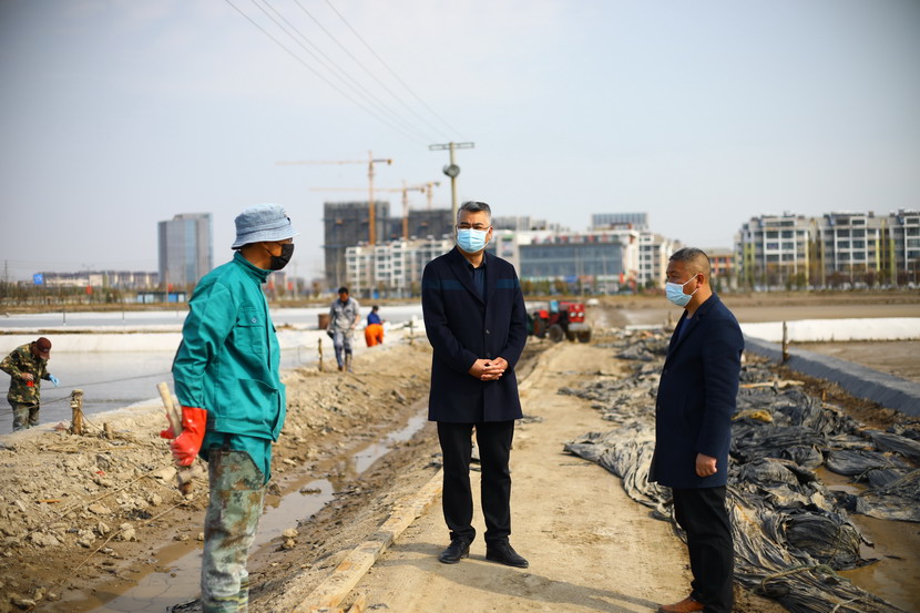 第一站來(lái)到海州灣公司昌圩班組。該班組41日礦鹵灌池,目前第四塊結(jié)晶池正在進(jìn)鹵,該公司三大組長(zhǎng)帶著各自隊(duì)伍都來(lái)支援,一起給新灌結(jié)晶池更換新塑苫布,大家忙的不亦樂(lè)乎。王董事長(zhǎng)首先慰問(wèn)大家,新冠疫情暴發(fā)以來(lái),海州灣公司廣大員工克服困難,一邊強(qiáng)化疫情防控,一邊加班加點(diǎn)抓生產(chǎn),雖然有的工作耽誤了,但是礦鹵灌池工作仍然趕在天時(shí)轉(zhuǎn)好之前進(jìn)行了。昨天進(jìn)鹵的結(jié)晶池底已經(jīng)鋪上了一層鹽,看起來(lái)甚是喜人。昌圩班組負(fù)責(zé)人,老先進(jìn)老黨員朱春年同志看到王董事長(zhǎng)來(lái)檢查工作,他也非常高興,和海州灣公司負(fù)責(zé)人劉天義一同聚攏過(guò)來(lái),與董事長(zhǎng)攀談,匯報(bào)工作。最后王董事長(zhǎng)強(qiáng)調(diào),一定要抓緊灌池,抓緊更換新塑苫布,打好“礦鹵復(fù)產(chǎn)”戰(zhàn),我們基礎(chǔ)產(chǎn)業(yè)牢固了,臺(tái)北的發(fā)展也就穩(wěn)固了。同時(shí),也不要忘記抓好疫情防控工作,職工集體工作時(shí)要保持一米線距離,保證不扎堆。劉天義、朱春年代表職工表態(tài),一定按照投資公司有關(guān)布置抓好各方面工作,一定拼命干,加油干,爭(zhēng)當(dāng)虎將打頭陣,當(dāng)好“臺(tái)北保衛(wèi)戰(zhàn)”主攻隊(duì)。