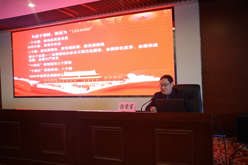下半場,張校長從一個主題,推動高質(zhì)量發(fā)展;兩件大事,發(fā)展與安全;三個新,新發(fā)展理念、新發(fā)展階段、新發(fā)展格局;新四個全面,全面建設社會主義現(xiàn)代化國家、全面深化改革、全面依法治國、全面從嚴治黨;“十四五”規(guī)劃堅持五個原則;“十四五”規(guī)劃目標,六個新;2035年遠景目標建議九項措施等九個方面解讀了全會精神的“新征程 新理念 新格局 新愿景”。
