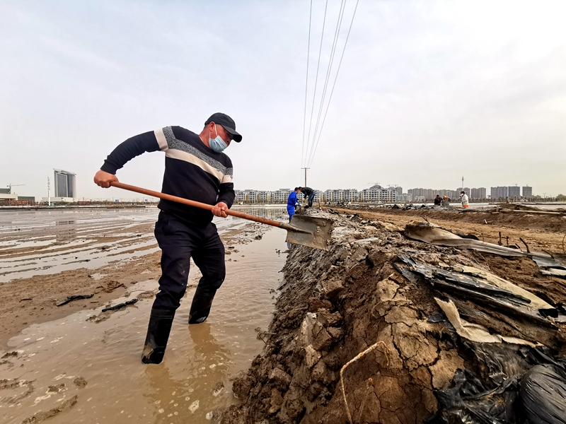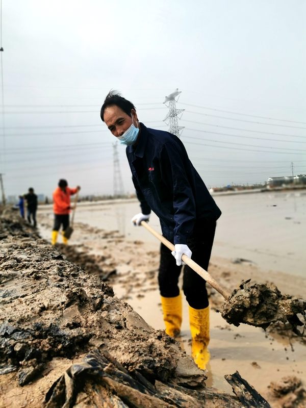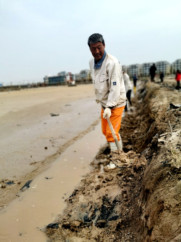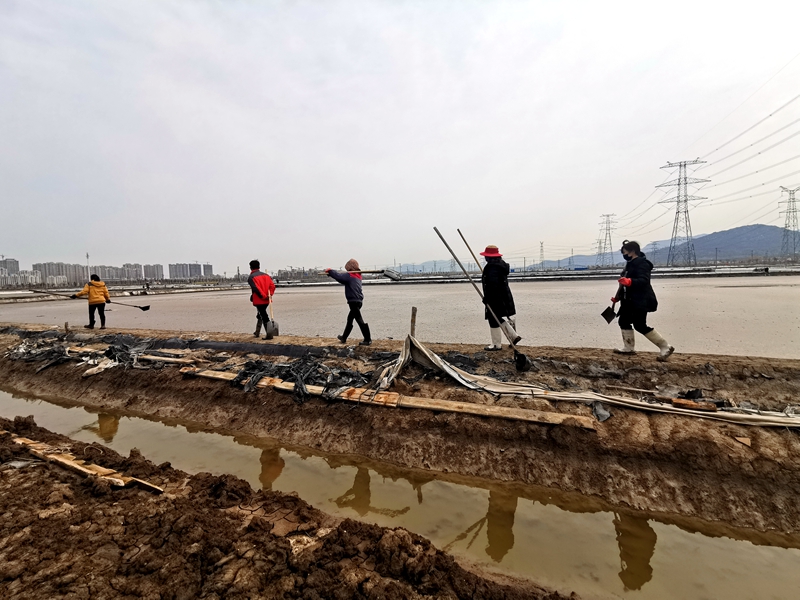 往東邊看,先鋒東灘黨旗招展分外鮮紅,海州灣公司18個單元職工、3名班組長全員出動馳援大浦工區(qū)協(xié)同重整410閑置鈣鹽灘地。引水入溝、翻泥上堰、腳踩和整、鐵掀蹋平,動作嫻熟。1200余米的10條池堰僅用一天的就順利完工。
