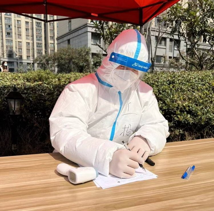 3月12日,社區(qū)統(tǒng)一安排,換了崗位,經(jīng)過(guò)崗前細(xì)致培訓(xùn)后,負(fù)責(zé)信息登記、測(cè)試體溫、發(fā)放檢測(cè)卡,服裝也由一次性塑料服換上了“大白服”。服裝升級(jí)了,說(shuō)明防護(hù)級(jí)別也升級(jí)了,他二話沒(méi)說(shuō),服從安排,迅速到崗?!澳茫?qǐng)?jiān)谶@邊登記信息,測(cè)量一下體溫”,這是他每天重復(fù)最多的話,他穿著密閉的防護(hù)服,連上一趟衛(wèi)生間都成了一件很奢侈的事情,為了節(jié)約醫(yī)療物資,早晨不敢多喝水,工作期間不喝水,直到檢測(cè)結(jié)束才和其他工作人員一起吃飯。有人問(wèn):“這項(xiàng)工作有風(fēng)險(xiǎn),怕不怕?”他說(shuō):“怕,當(dāng)然怕,但和身邊的醫(yī)護(hù)人員比起來(lái),我這點(diǎn)真不算什么,向他們致敬!”目前,他所在小區(qū)已經(jīng)進(jìn)行了13次全員核酸檢測(cè),他每次早上7點(diǎn)到崗,下午2點(diǎn)左右結(jié)束,脫下防護(hù)服后背都是濕漉漉的。