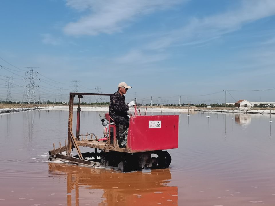 此時的鹽層大約已有五六厘米厚,若想長出晶瑩剔透的大顆粒晶體鹽,活碴作業(yè)是必不可少的。每日清晨6點,昌圩班組、先鋒班組、大浦班組準(zhǔn)時有一名工人駕駛活碴機,對鹽池板進(jìn)行破碎翻動,保持鹽層的疏松和顆粒間一定的間隙,確保晶體長得既快又好。通過活碴,鹽顆粒散亂在池底,經(jīng)過陽光照射會產(chǎn)生不規(guī)則的反射,大大減少了光線反射回水面的概率,易于提高鹵水溫度,增大鹵水蒸發(fā)量,從而增加原鹽的產(chǎn)量。