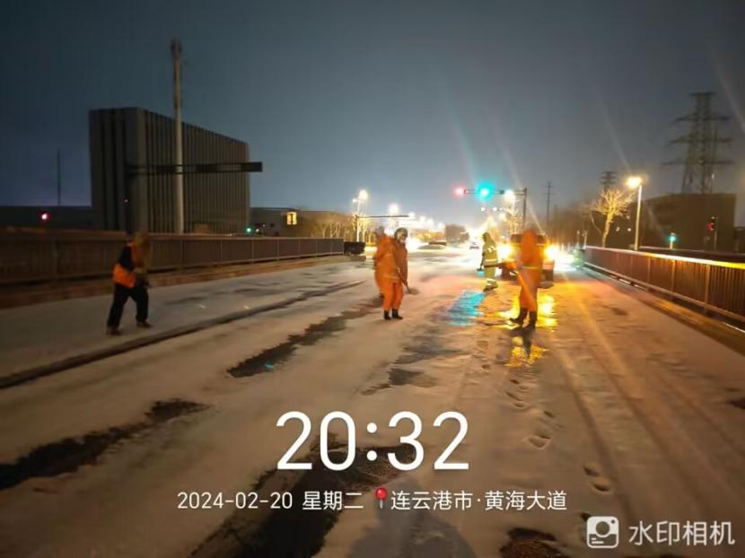 夜晚10點(diǎn),在黃海大道,支部書記范曉寶親自帶隊(duì),帶領(lǐng)張巖、盛小雷、薛加兵等6名黨員,冒雪奮戰(zhàn)、連續(xù)作業(yè),拋撒融雪劑,進(jìn)行緊急除雪除冰作業(yè)。