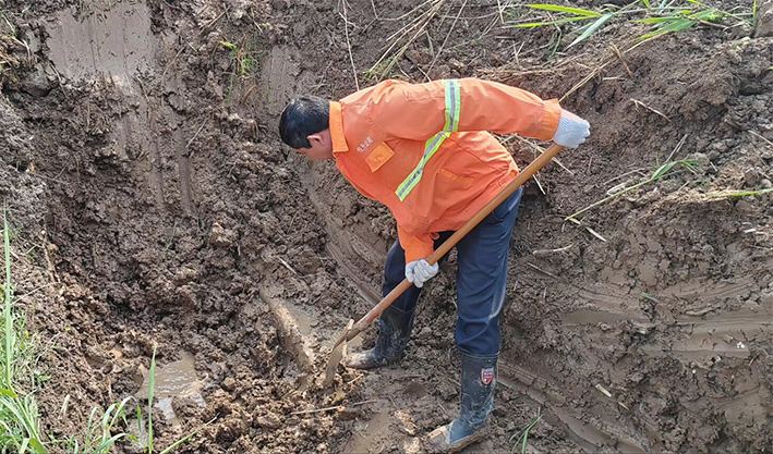 市政分公司組織搶修人員迅速到場(chǎng),調(diào)集挖機(jī)與搶修材料,有序開展應(yīng)急搶修。維修人員首先對(duì)漏水管道實(shí)施開挖,經(jīng)過(guò)維修人員仔細(xì)挖開后確定直徑110PVC管道老化導(dǎo)致管道連接端裂開。查明原因后,制定了相應(yīng)可行的搶修方案。搶修過(guò)程中,大伙不畏困難、分工有序,相互協(xié)作,在滿是泥濘的坑中開展維修作業(yè)。機(jī)械開挖、人工配合清淤、更換損壞管道、增設(shè)哈夫節(jié)等一系列的步驟,一通操作下來(lái),搶修人員人人汗流浹背。經(jīng)過(guò)3個(gè)多小時(shí)連續(xù)奮戰(zhàn),高效完成此次搶修任務(wù)。