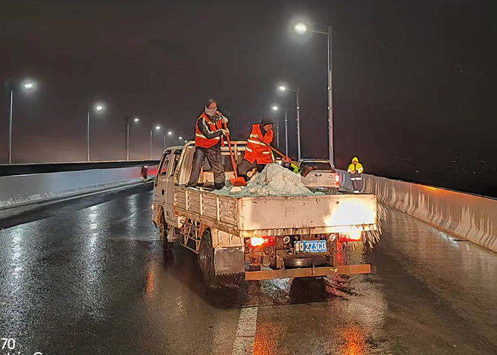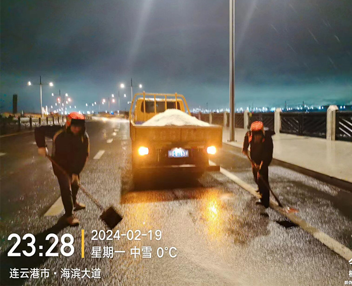 該公司迅速啟動(dòng)突發(fā)天氣應(yīng)急保障預(yù)案,近30余名道路應(yīng)急排險(xiǎn)突擊隊(duì)員,在公司統(tǒng)一按排下 ,裝車備運(yùn)融雪鹽斤近15噸,現(xiàn)場工作中隊(duì)員們士氣高漲,無所畏懼。夜間8時(shí)左右,10余名黨員先鋒,兵分三路再次安全有序奔赴燒香河、海濱大道、228等路段橋梁,無懼大風(fēng)夾著冰雨顆粒吹打臉頰,兩人一對(duì)、三人一組、揮動(dòng)手中鐵銑,汗水與冰雨濕透橙色衣衫,經(jīng)過近4個(gè)多小時(shí)努力奮戰(zhàn),人工撒放融雪鹽斤近20余噸,高質(zhì)高效保障近30座橋梁安全通暢。
