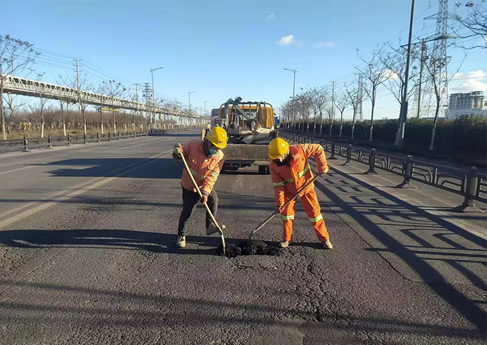 市政分公司對(duì)受損瀝青路面進(jìn)行集中修補(bǔ)