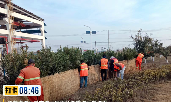 風(fēng)障防寒加速進(jìn)行。該分公司采購草簾500余個(gè),對金港路、泰和路夾竹桃等不耐寒綠植精心呵護(hù)。確保低溫植株不被凍傷,不出現(xiàn)大面積凍害現(xiàn)象。目前已圍草簾300余個(gè)。